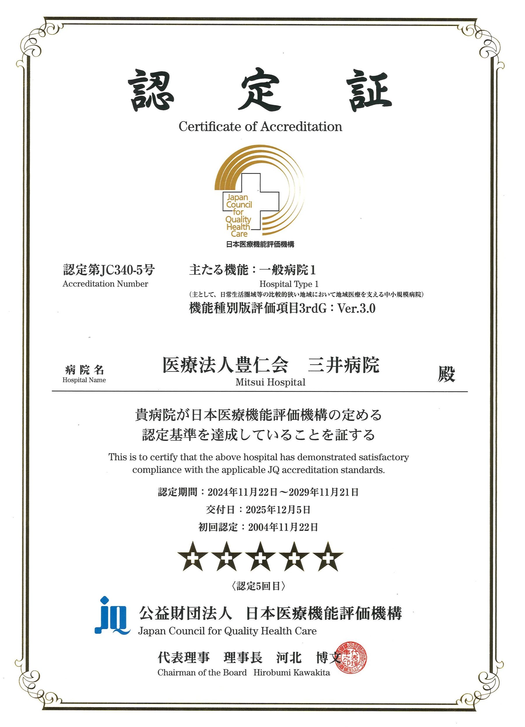 このたび、公益財団法人日本医療機能評価機構の実施する病院機能評価(3rdG:Ver.3.0)の一般病院1を受審し認定されました。 今回の認定で5期連続となりました。