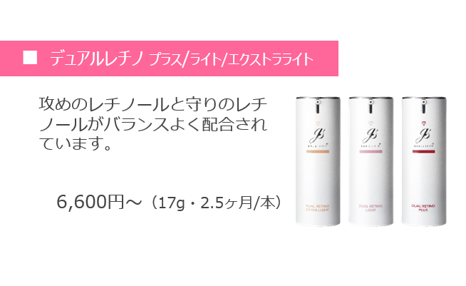 インナーモイストTAローション→エクラリバイブ→ディアルレチノ(プラス/ライト/エクストラライト)=35,420円(税込)